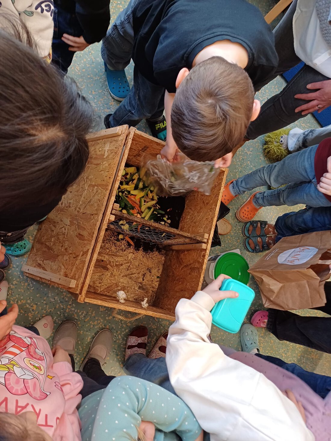 Seit heute wohnen in unserem Klassenraum zwischen 300 und 500 Regenwürmer. Eine Frau von der GWA richtete für die Regenwürmer eine Kiste ein. Wir haben jetzt die Aufgabe, diese mit Biomüll zu füttern, damit sie für uns Komposterde machen. Wir sind gespannt!