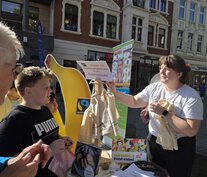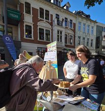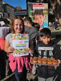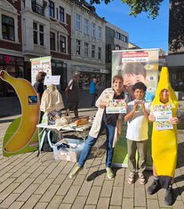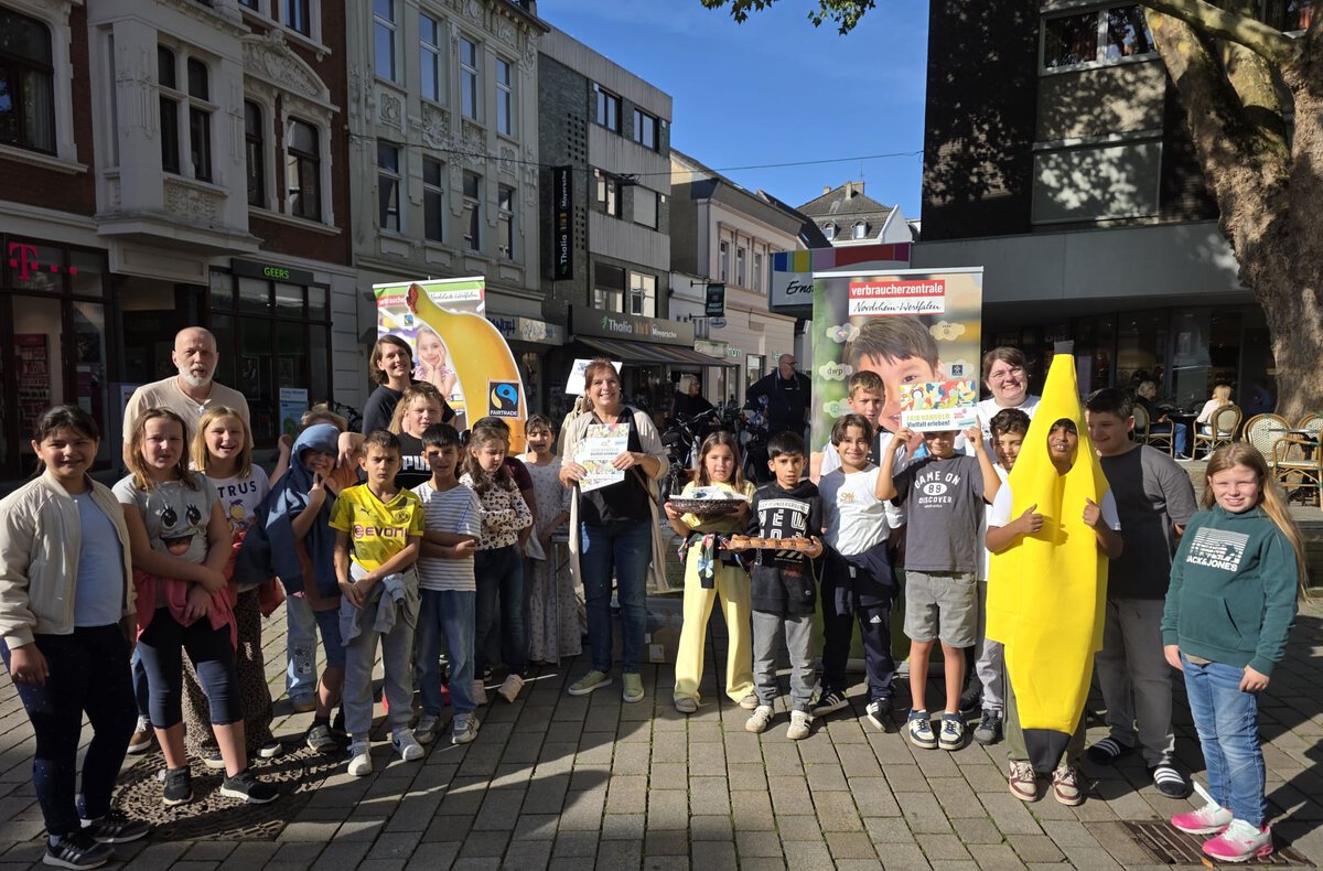 Auch die Klasse 4b der Diesterwegschule war dabei. Sie veranstalteten gemeinsam mit Umweltberaterin Jutta Eickelpasch von der Verbraucherzentrale einen Infostand auf dem Kamener Wochenmarkt. Aktiv unterstützt wurden sie von Frau Geisler und Frau Lespagnol. Am Stand gab superleckeres, veganes Bananenbrot (aus fairen Bananen, Danke an Bäckerin Frau Lespagnol) zu probieren, sowie faire Rezepthefte und Informationen zum Thema 2025 "Vielfalt erleben!".