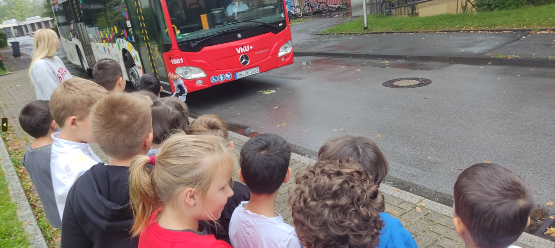 Die Busschule war bei uns an der Diesterwegschule für den 2. Jahrgang. Die Kinder haben viel gelernt. Es gibt nämlich einiges zu beachten, draußen an der Bushaltestelle und drinnen im Bus. Von den unübersehbaren Stellen über den Bereich wie weit der Bus beim Ankommen über die Bordsteinkante ragen kann bis hin zur Vollbremsung wurde den Kindern alles sehr anschaulich demonstriert. Jetzt sind wir vorbereitet auf alle zukünftigen Fahrten mit dem Bus.