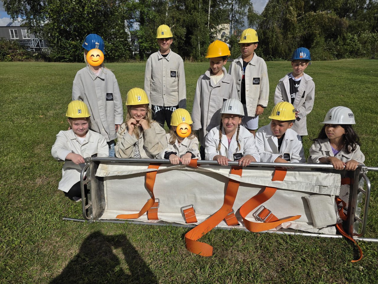 Kurz nach den Ferien waren wir Fledermäuse direkt mal beim außerschulischen Lernort der Zeche Monopol. Mitglieder des Vereins Monopol 2000 e. V. haben uns, nachdem sie uns im letzten Schuljahr schon so toll bei der Umsetzung des Zirkusprojekts unterstützt haben, dieses mal den Bergbau, der zur Geschichte Kamens gehört, näher gebracht. Die Kinder durften vieles selbst ausprobieren wie z. B. einen großen Stein mit einem Abbauhammer bearbeiten. Wenn jemand "unter Tage" (was das bedeutet, wissen die Kinder nun auch) verletzt war, mussten die anderen ihn mit einer Trage abtransportieren. Auch das haben die Kinder nachgestellt. Auf dem Foto ist die eine Gruppe der Klasse, die das gerade ausprobiert hat.